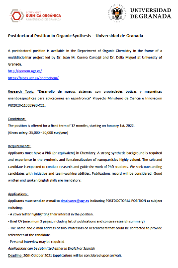Se ruega que todos los posibles candidatos se pongan en contacto con el Prof. Juan Manuel Cuerva (jmcuerva@ugr.es) o Prof. Luis Álvarez de Cienfuegos (lac@ugr.es) lo antes posible. El plazo límite de dicha convocatoria será el 17 de Junio de 2020.