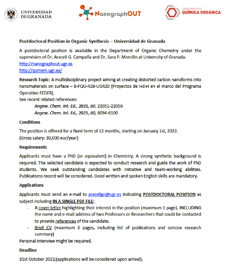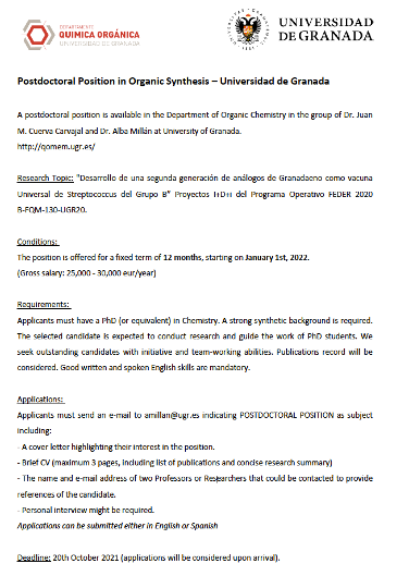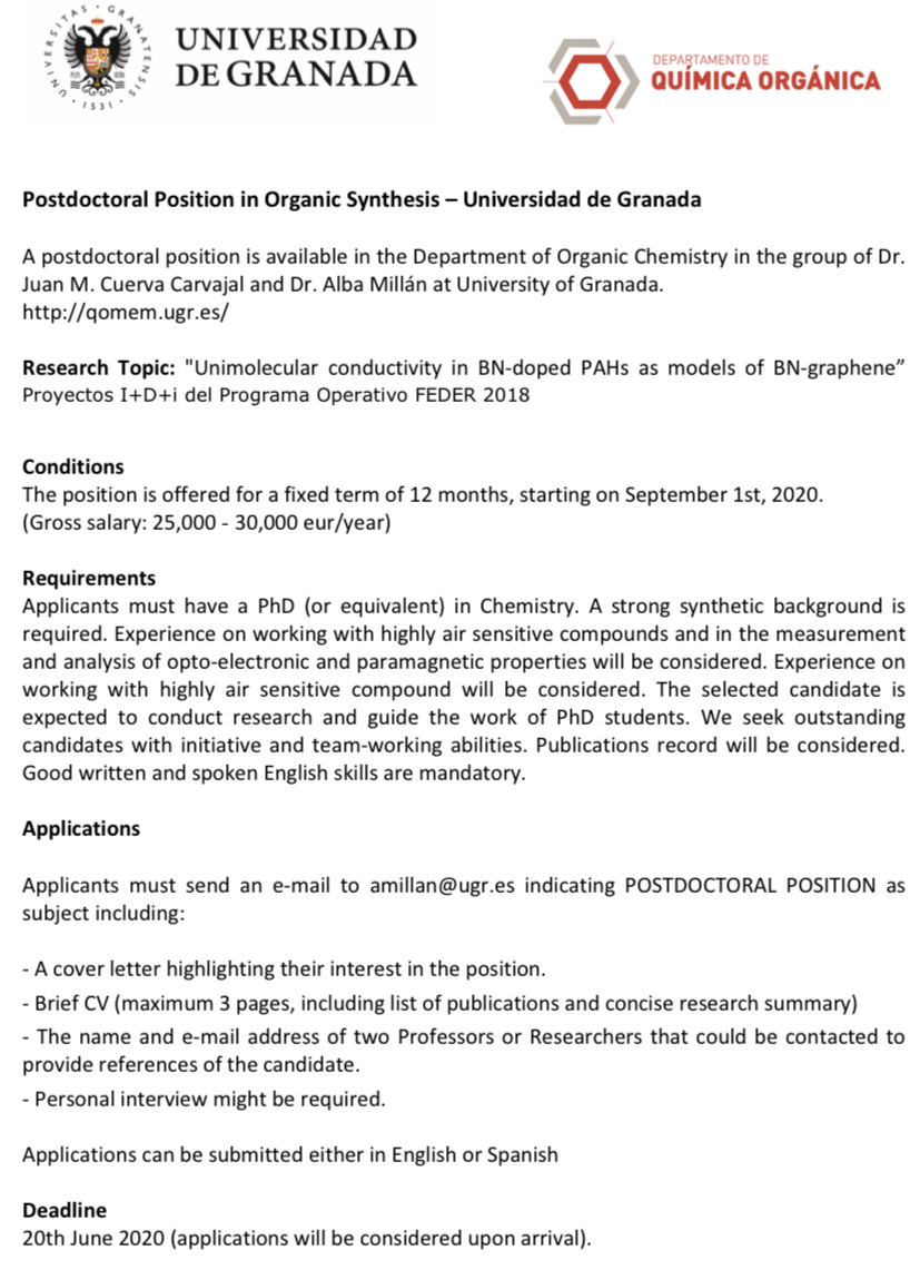 Se ruega que todos los posibles candidatos se pongan en contacto con el Prof. Juan Manuel Cuerva (jmcuerva@ugr.es) o Prof. Luis Álvarez de Cienfuegos (lac@ugr.es) lo antes posible. El plazo límite de dicha convocatoria será el 17 de Junio de 2020.